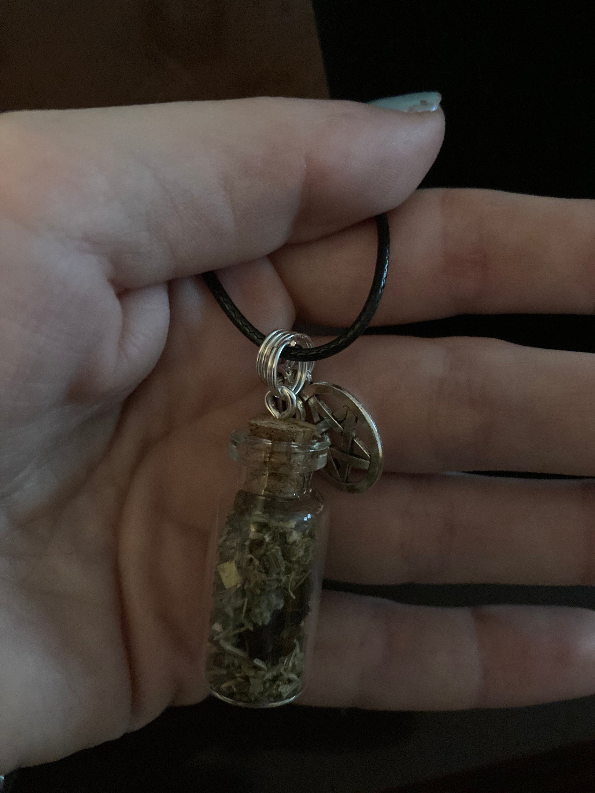 The jar includes herbs and other money drawing/ employment drawing ingredients that are influenced to bring potential job opportunities to the person wearing this necklace.