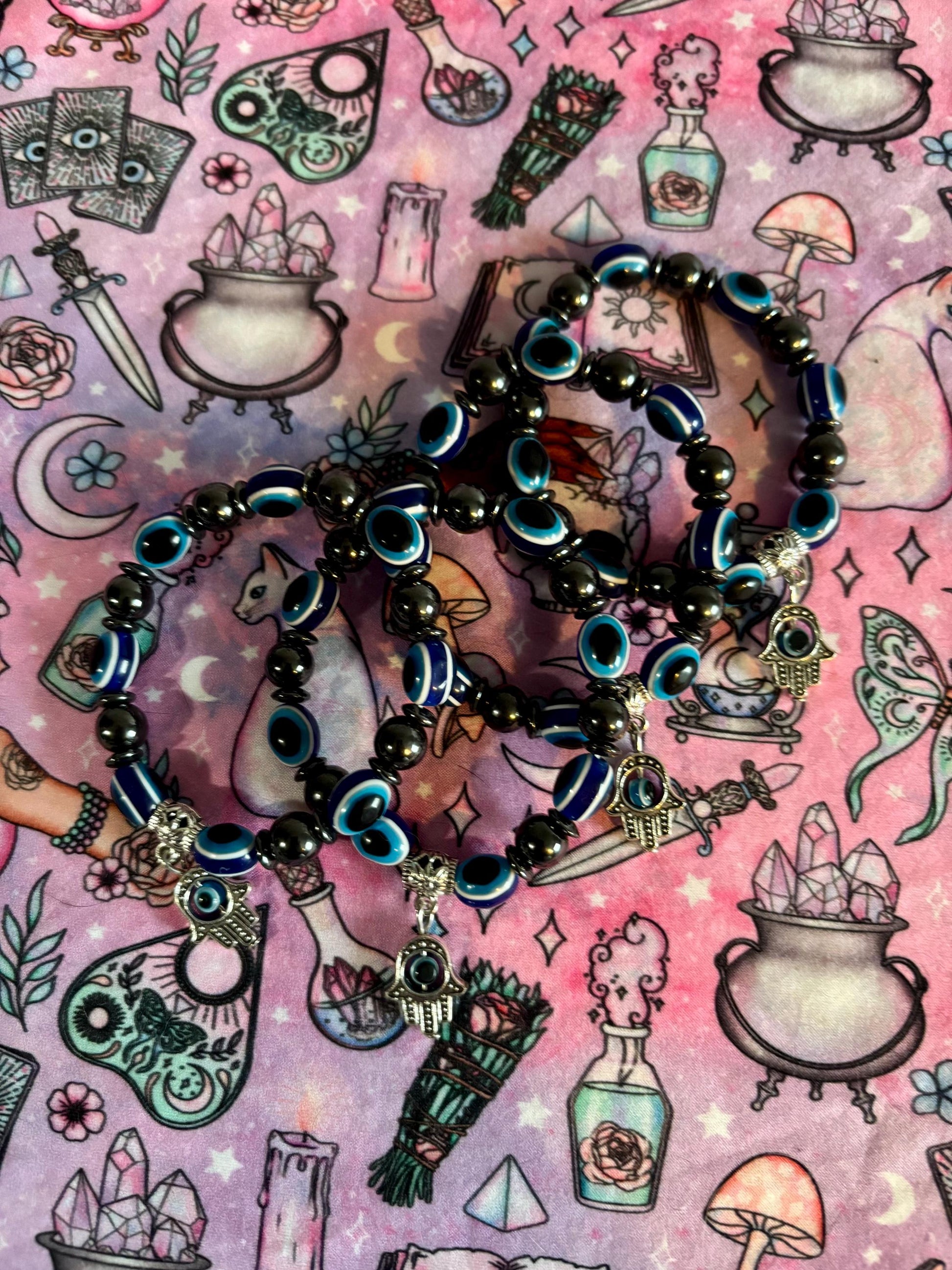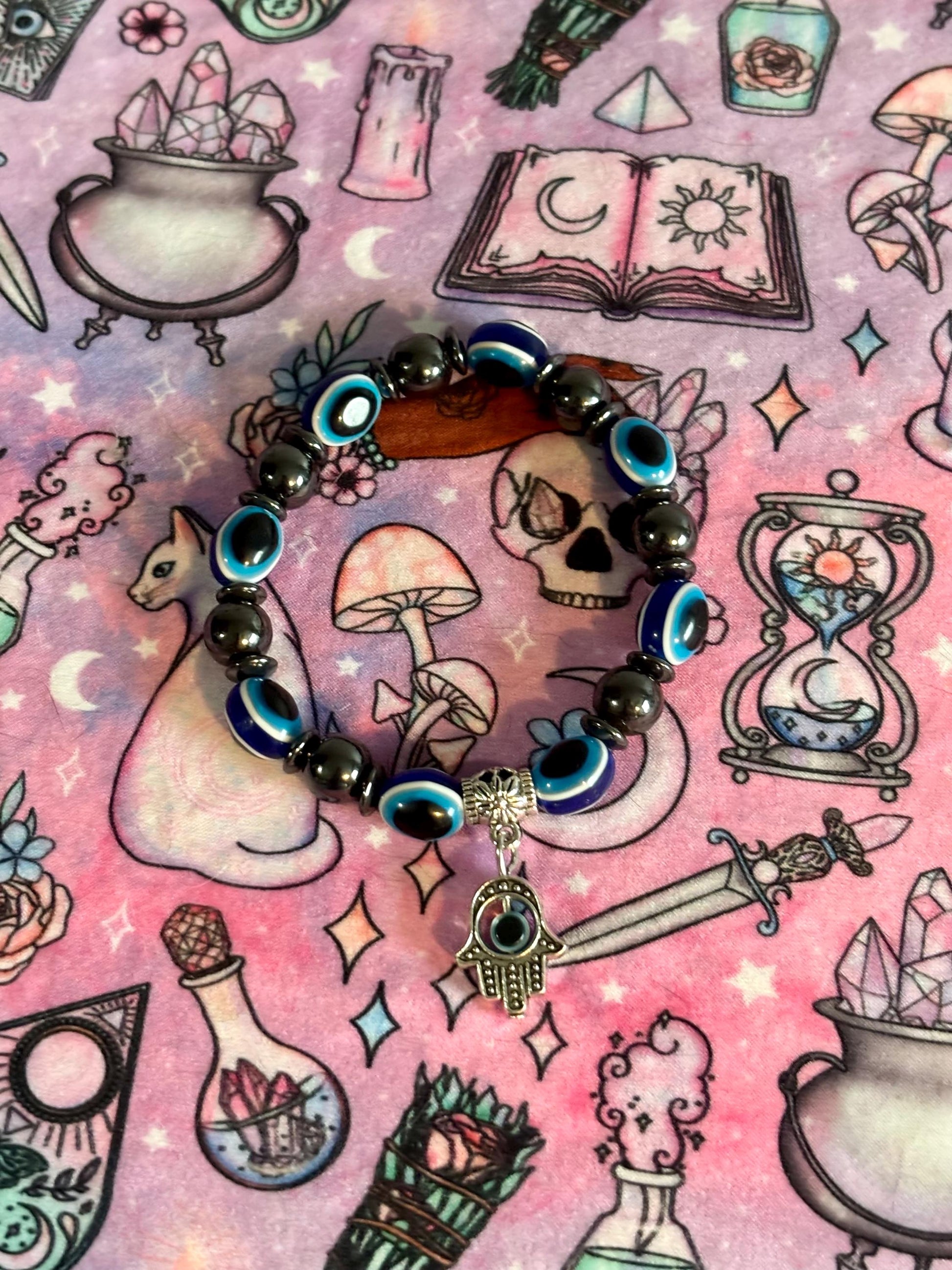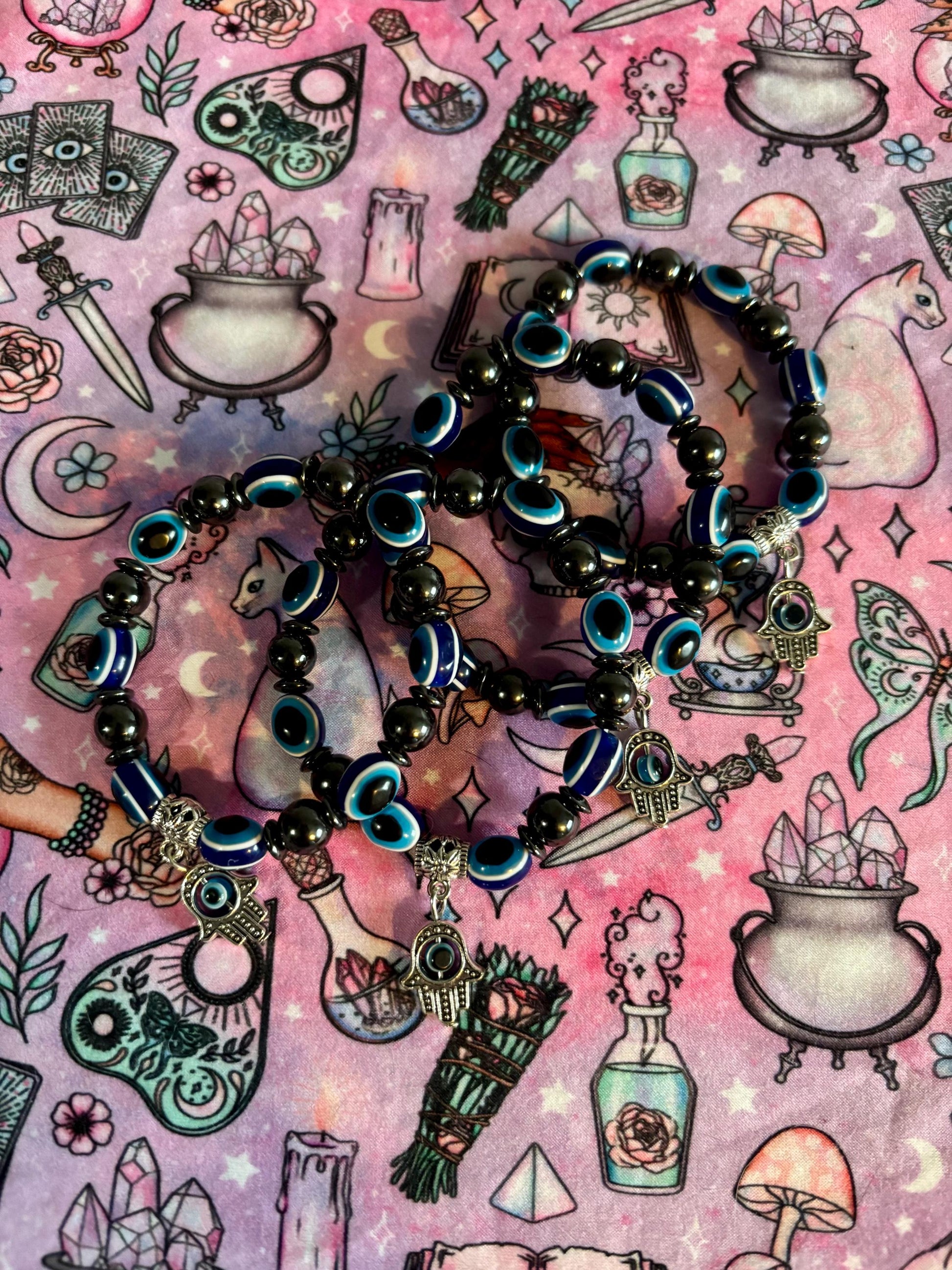 Introducing our Evil Eye Bracelet, a captivating fusion of artistry and mystique that echoes the ancient witchcraft traditions. This exquisite amulet is more than just an accessory; it's a powerful token for banishment and protection. Adorn your wrist with its intricate design, where each bead embodies the timeless charm of the evil eye, a symbol revered for warding off negativity.